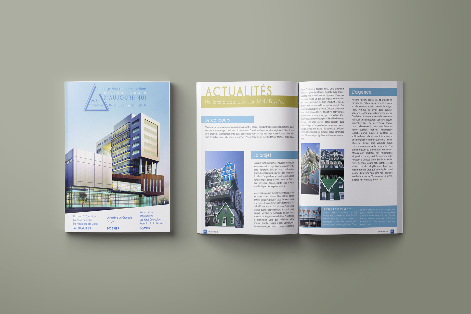Réalisation de trois propositions de maquettes pour le magazine fictif Art’Chitecture. Conception de la couverture, sommaire et mise en page des articles.